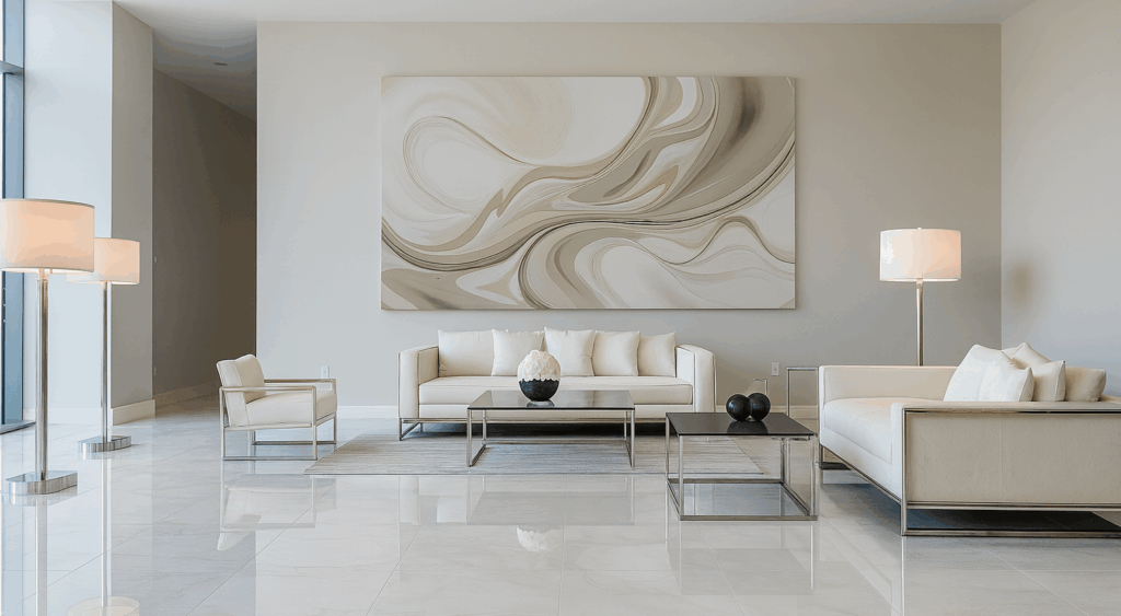 Luxury interiors are leaning into warmer woods and tactile finishes. “Lighter tones still feel coastal and fresh, but now we’re seeing richer taupes, walnut browns, and honey oaks making a comeback,” says Martel. Large-format porcelain tiles (24″x24″ or bigger) with rectified edges are ideal for seamless flow and visual spaciousness. These tiles minimize grout lines and support the streamlined look dominating 2026 luxury interior design trends.